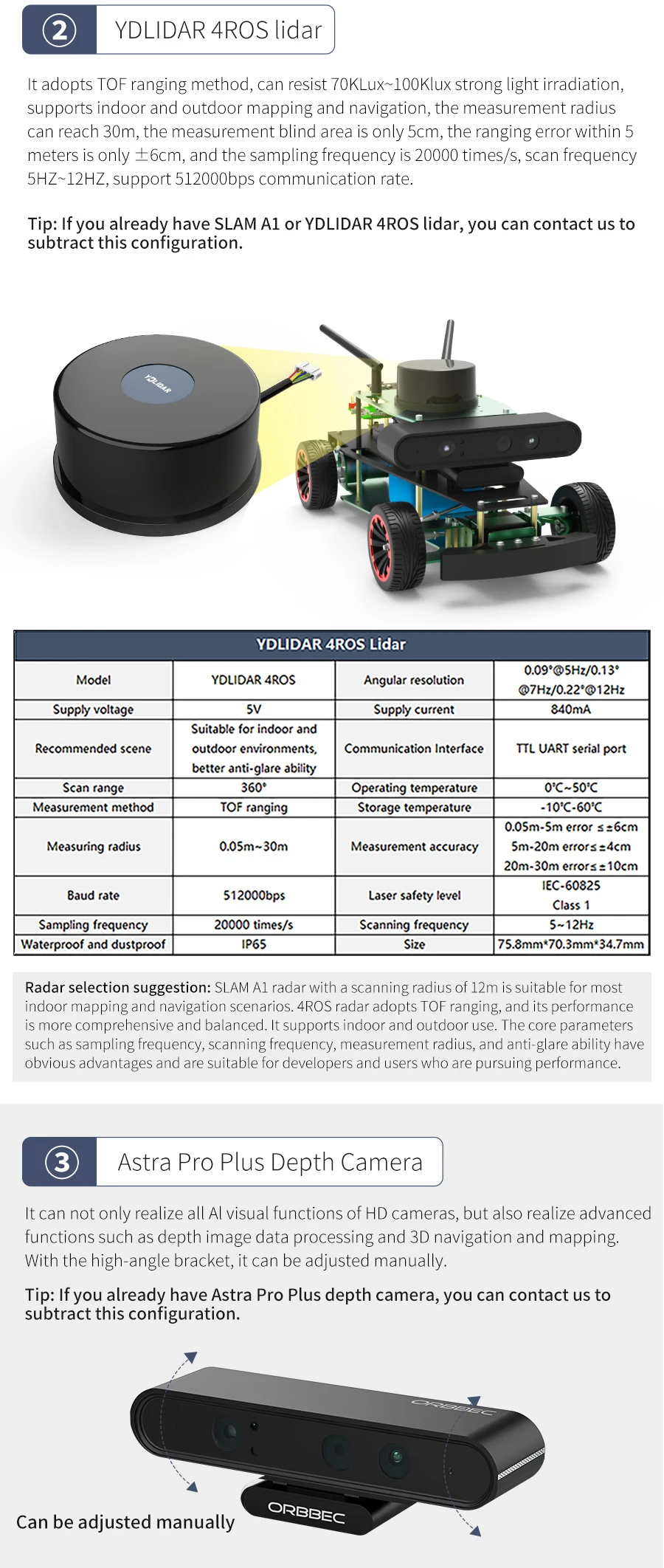 (2) Various accessories such as lidar (SLAM A1/YDLIDAR 4ROS), depth camera, voice interaction module and 7-inch display screen can be selected by users.