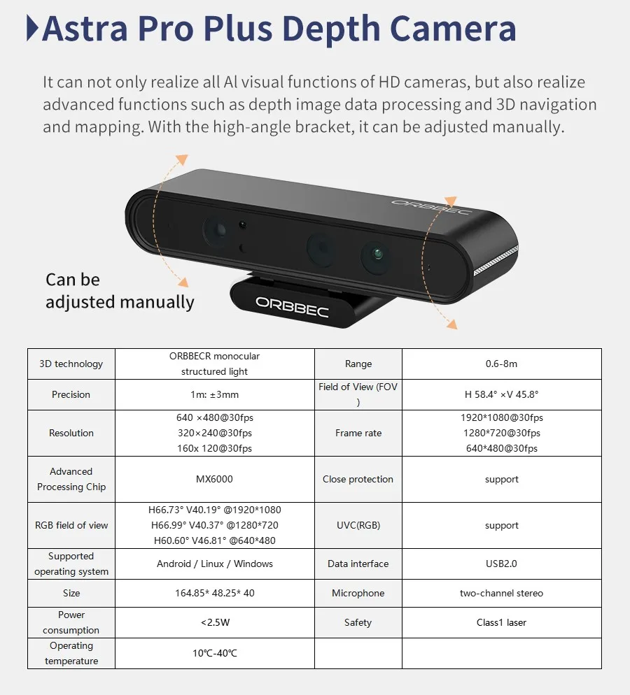 Astra Pro depth camera: You can manually adjust the tilt angle of the camera to achieve depth image data processing, 3D navigation and mapping and other AI visual functions.