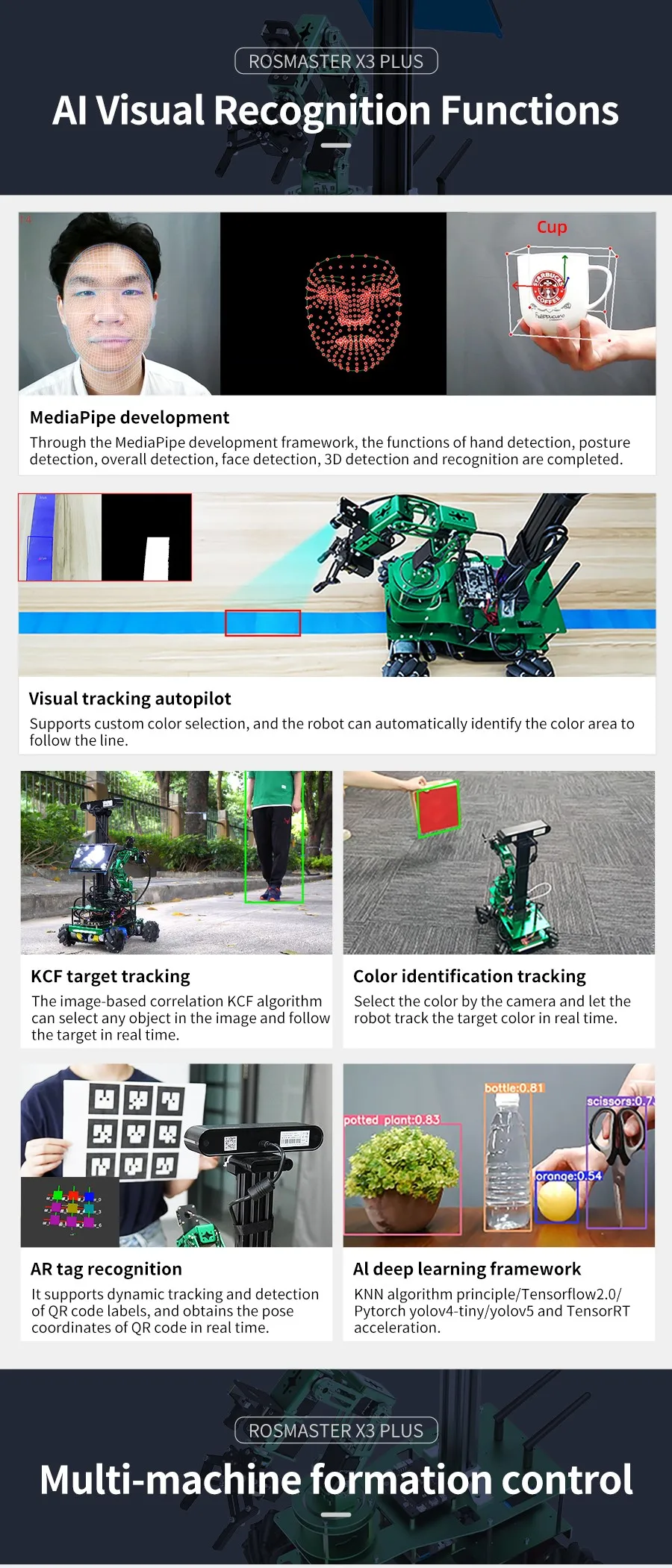 Mapping navigation, multi-point navigation, path planning, obstacle avoidance and follow.