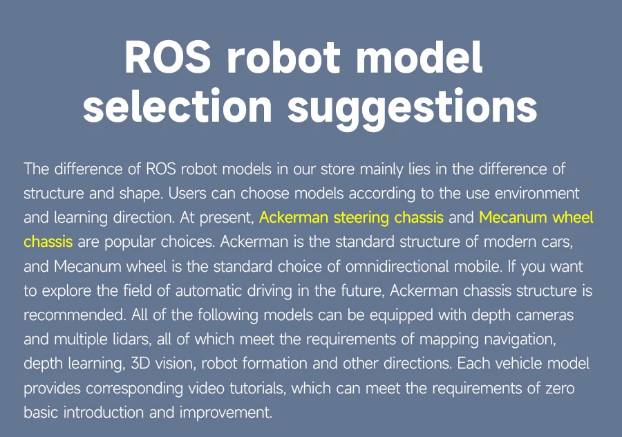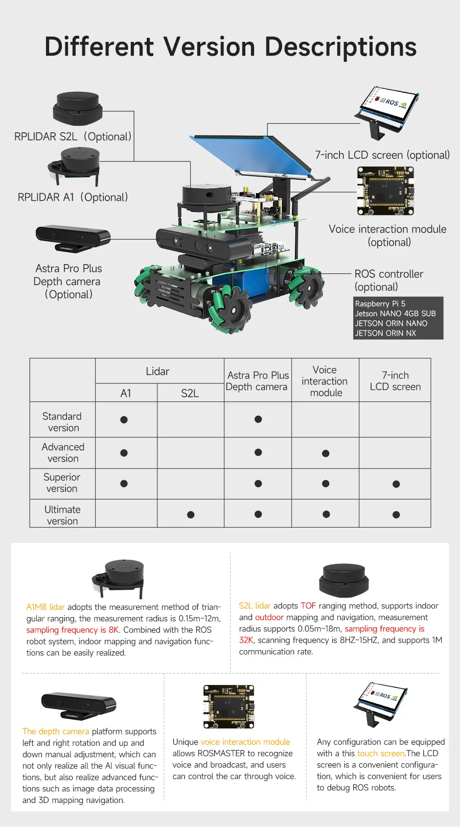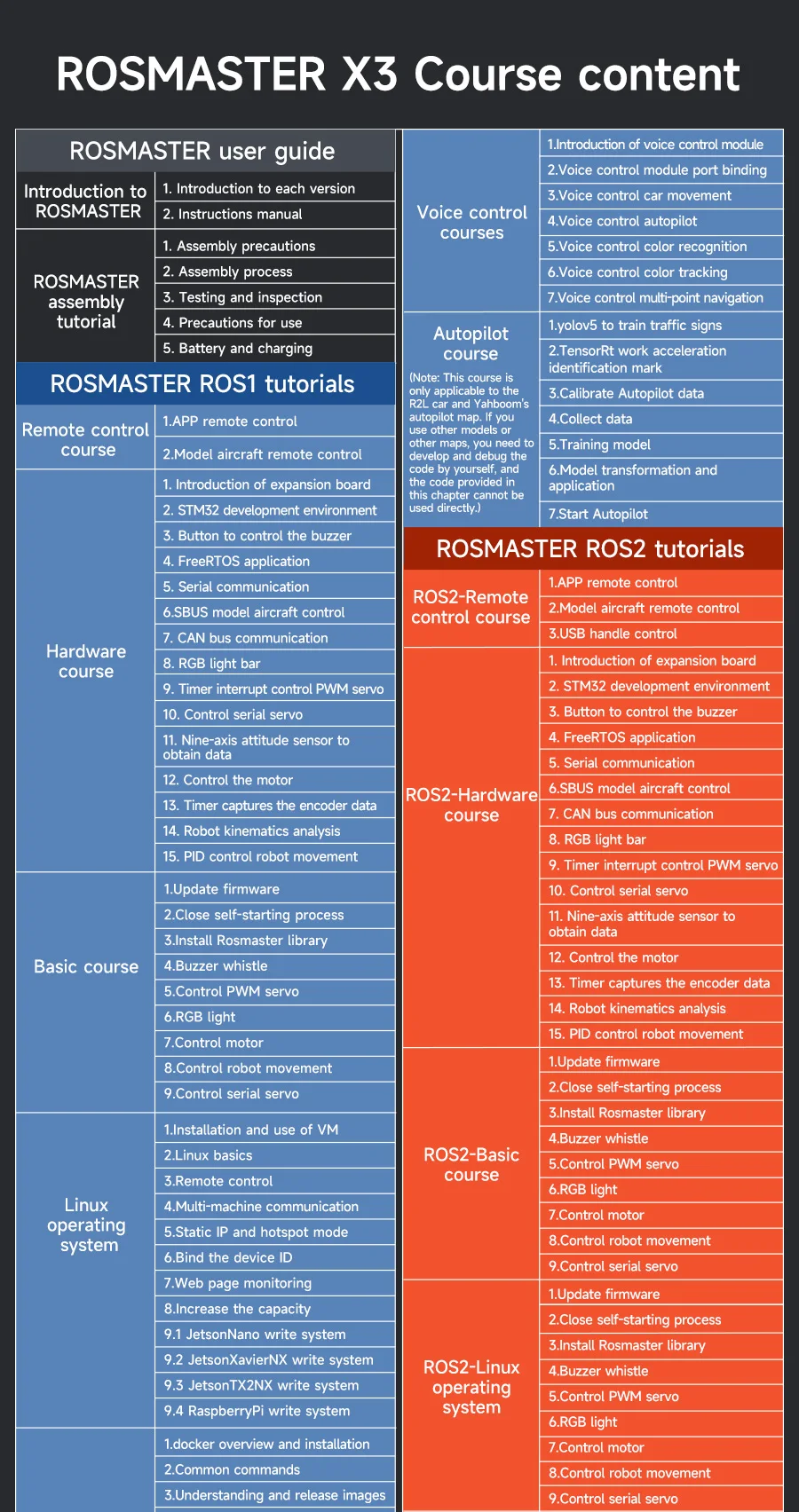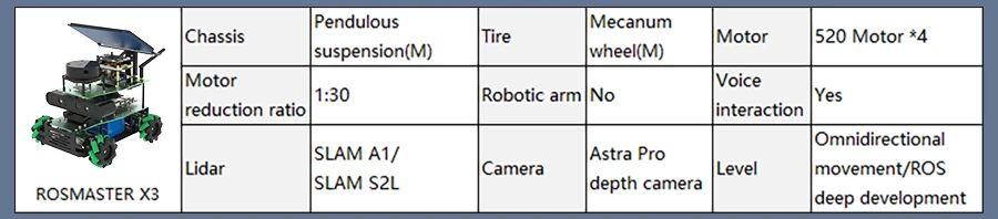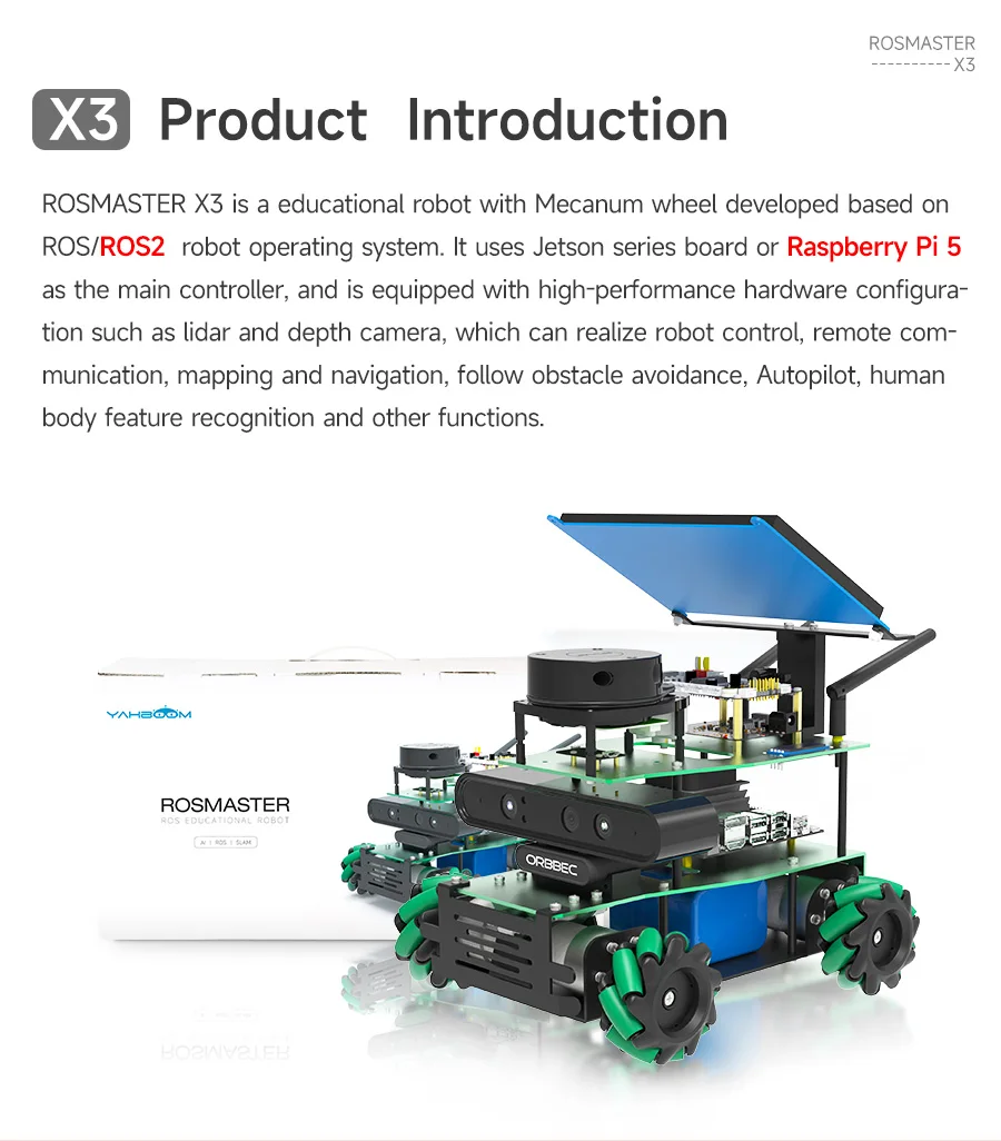 ROSMASTER X3 is an educational robot based on the robot operating system with Mecanum Wheel, compatible with Jetson NANO/Orin NX/Orin NANO and Raspberry Pi 5. It is equipped with lidar, depth camera, voice interaction module and other high-performance hardware modules. Using Python programming, ROSMASTER X3 can realize mapping and navigation, following or avoiding, Autopilot and human body posture detection. It support APP remote control, APP mapping navigation, handle remote control, ROS system PC control and other cross-platform remote control methods. We provide 103 video courses and a large number of codes, which can allow users to learn artificial intelligence programming and ROS systems.