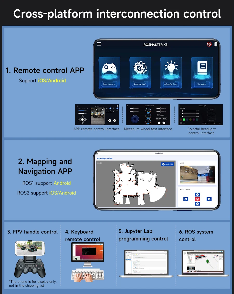 Various remote control methods such as mobile phone APP, handle, ROS system and computer keyboard.
