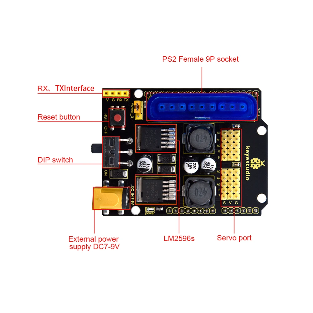 It contains 10 IO interfaces used to connect servos or other sensors.in addition, we have also extended RX/TX interfacesto interface withserial communication modules likeBT modules.