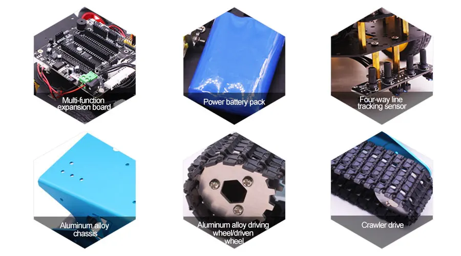It supports multiple basic functions: high angle climbing, tracking, overing the obstacle, etc.
