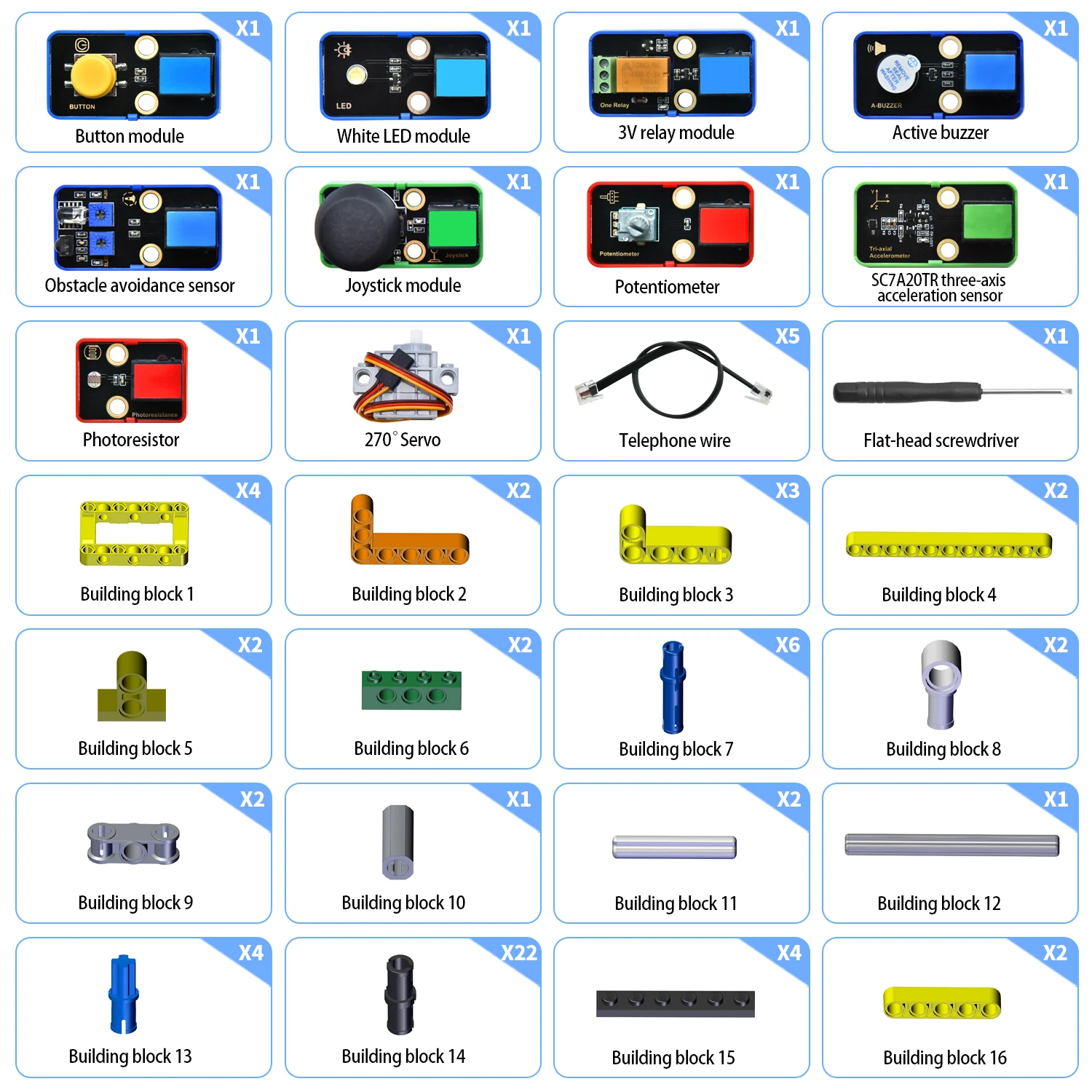 In this kit, multiple sensors and modules are included: white LED module, 3V relay module, button module, active buzzer, obstacle avoidance sensor, photoresistor, potentiometer, joystick module, SC7A20 three-axis acceleration sensor and servo. Besides, it can transforms into six appearances with building blocks: manual lighting, automatic lighting, light adjustment, smart trash can(manual mode), smart trash can(automatic mode), smart trash can(drop alarm). The building blocks are provided, so you may design forms at will, which greatly improves logical analysis, creativity, hands-on skills and problem-solving ability.