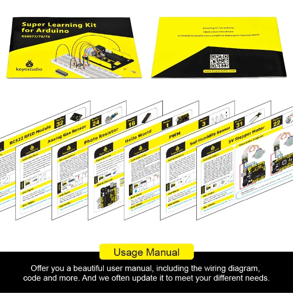 Keyestudio super learning kit is suitable for Aduino enthusiasts. This kit includes 32 projects with detailed tutorials, starting from the basics to more complex projects. Different from other kits, it adds some functional modules, such as RFID, temperature and humidity module. There is connection diagram and code for each project, making it easy for you to learn.