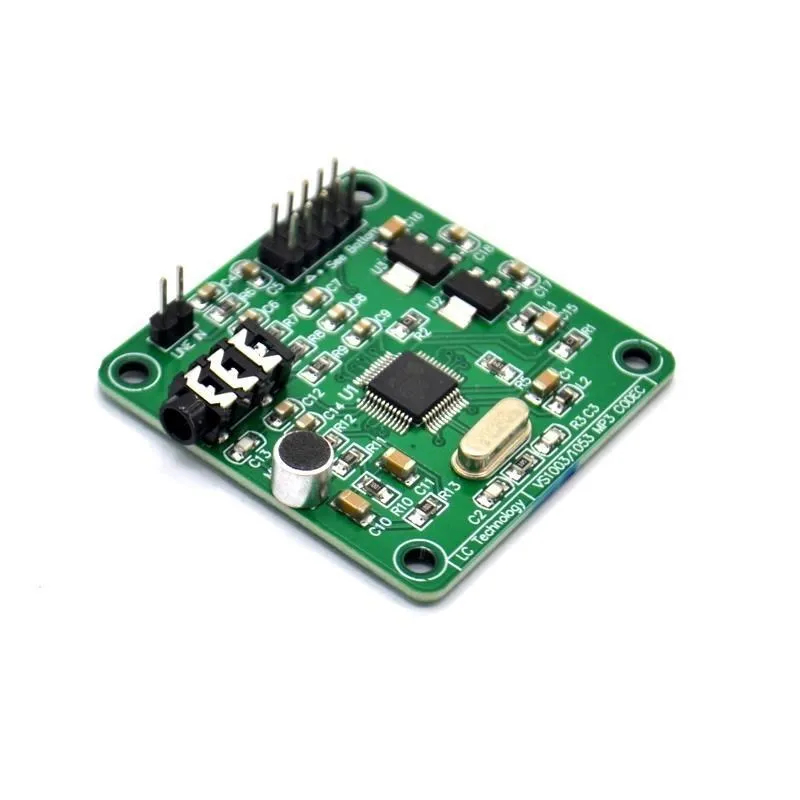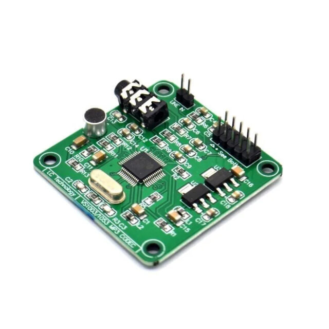 The VS1003 audio codec module is a complete MP3/WMA/MIDI audio decoder and ADPCM encoder which features a high quality stereo DAC (Digital to Analog Converter), a 16-bit adjustable ADC (Analog to Digital Converter) and a high quality stereo earphone driver (30 Ohm). This module is ideal for adding audio decoding and encoding capabilities to embedded systems.