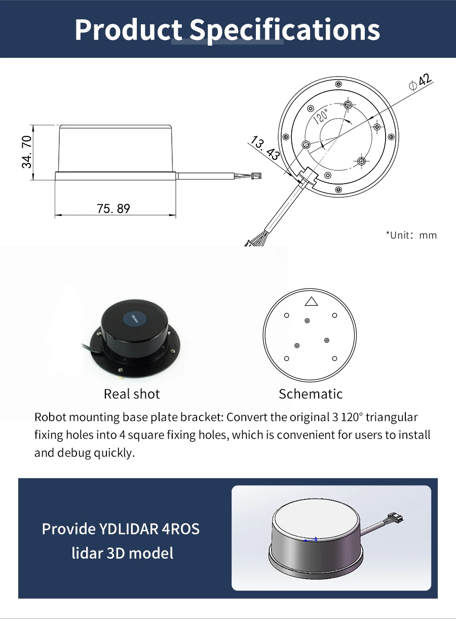 This YDLIDRA 4ROS lidar is only 7.58cm*3.47cm in size. It comes with a motor driver with speed regulation function inside, and IP65-rated closed protective cover on the outside, which is waterproof and dustproof. Using TOF technology, sampling frequency is 2000 times/S, scanning radius can reach about 30m. Due to it can resist the strong light environment of 100KLux, users can use it to achieve high-precision ranging and mapping no matter indoors or outdoors. We will provide open source codes for ROS1/ROS system and robot lidar mapping scanning.